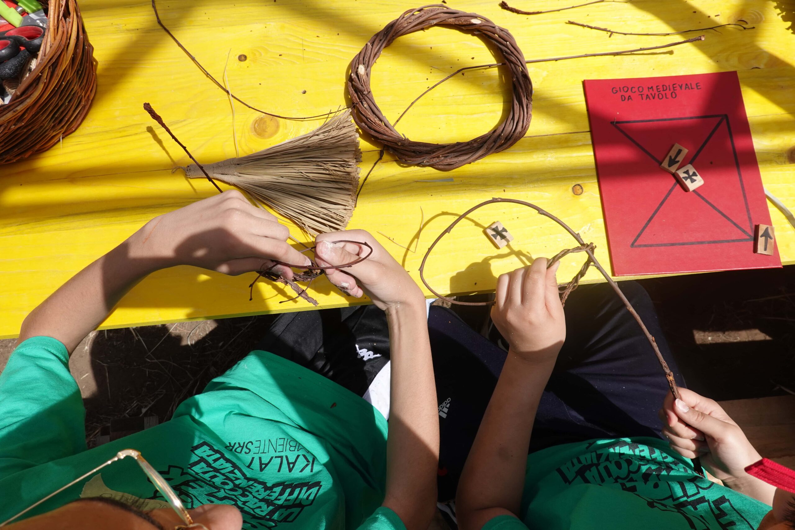 Parallelamente, si è intrapreso un percorso di scoperta delle specie vegetali utilizzate storicamente nella cultura materiale contadina per pratiche artigianali. Questo percorso ha coinvolto i partecipanti in un’azione di intreccio vegetale, finalizzata alla realizzazione di piccoli manufatti utili attraverso il contatto diretto e materico con gli elementi naturali. L’arte dell’intreccio diventa così uno strumento per ristabilire un legame profondo con l’ambiente, riattivando saperi, gesti e relazioni radicate nel territorio.