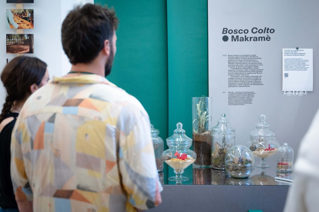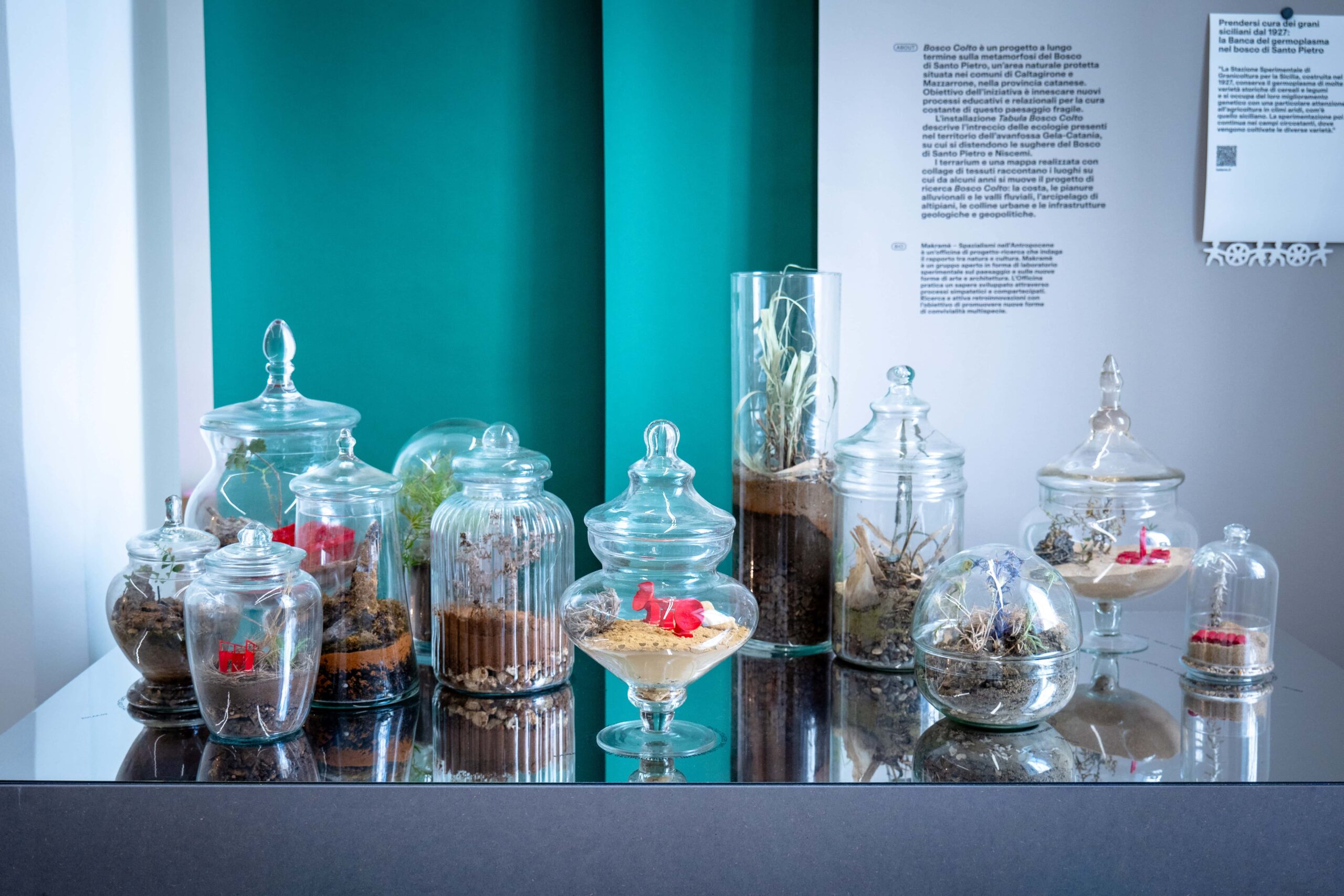 L’installazione descrive, attraverso un paesaggio di terrarium di forma diversa, l’intreccio delle ecologie nel territorio dell’avanfossa Gela-Catania (su cui si distendono le sughere del bosco di Santo Pietro e Niscemi) caratterizzato da cinque ecosistemi: la costa, le pianure alluvionali e le valli fluviali, l’arcipelago di altipiani, le colline urbane e le infrastrutture geologiche e geopolitiche.